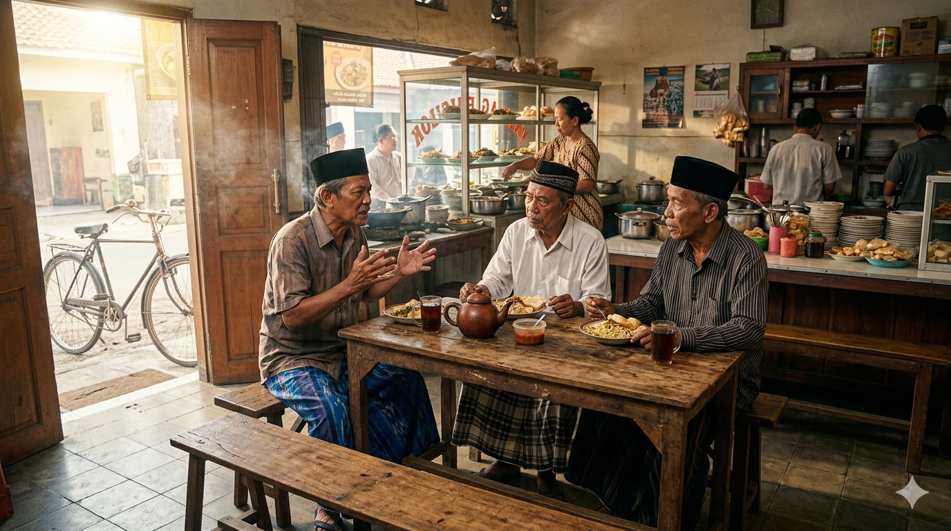 Dine kiye, Man Damin pengin sarapan sing luwih enak, aja lawuh adug-adug tempe bae. Biasane langganane Man Damin ning ora warung Kasmud ya…warunge Yu Tur sing nang mburi pasar esuk. Angger ndeleng glagate tah sing pan diparani Man Damin warunge Yu Tur. Bener bae, Man Damin maring warunge Yu Tur. Sawise Man Damin ngunci pite nang ngarep warunge Yu Tur, Man Damin bledeng manjing warung. Nang njero warung wis ana Wa Kemung. Gurung suwe njagong, jenggonggos Wa Kamid teka. Dadi pepek wong telu sing biasane kumpul-kumpul moci bareng. Sawise pesen sega lengko, Man Damin mulai mreceka.