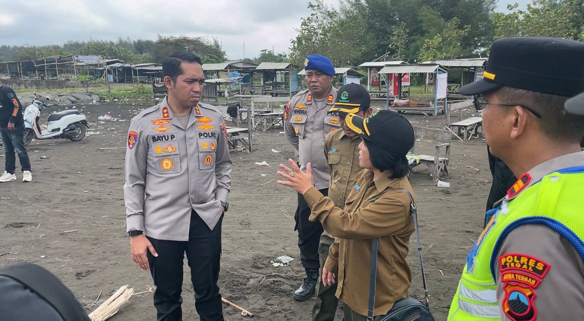 SLAWI, smpantura – Kapolres Tegal AKBP Bayu Prasatyo dan Administratur KPH Pekalongan Barat Maria Endah Ambarwati mengecek tumpukan kayu di Pantai Larangan, Desa Munjungagung, Kecamatan Kramat, Kabupaten Tegal, Selasa, 27 Januari 2026 pagi.
