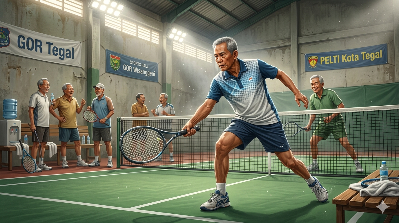 Sauwise salaman karo pak Purnomo, enyong salaman karo pak Edi Pranowo. Jare pak Edi, “Pokoke kanggone enyong tah, angger ana pak Maufur, kanca-kanca pemkot sing doyan tenes pada seneng kabeh, gadi perlu diulemi kusus”. Bar kuwe, wong telu manjing nang lapangan tenes. Anjog nang njero wis ana pak Yakin Basuki. Kacek sadelat, teka pak Felik. Enyong njagong bareng-bareng sameja, ngobrol wong telu. Istilahe pak Edi Pranowo yen ngarani, “Mereka para sesepuh olah raga tenes Kota Tegal”. Enyong sih mung mbatin, ya pancen sesepuh, wong umure wis sepuh-sepuh.