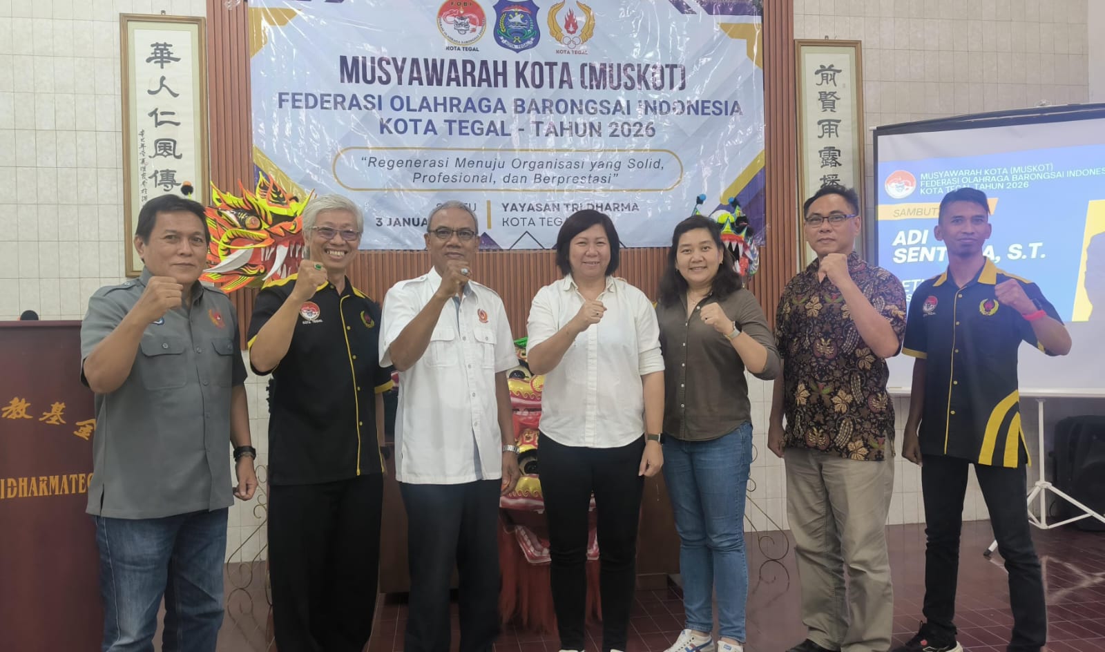 Di tengah persiapan mengikuti Kejuaraan Internasional Barongsai di Hainan, Cina, pada 18-20 Januari 2026, FOBI Kota Tegal resmi menetapkan Adi Sentosa sebagai ketua baru melalui Musyawarah Kota, Sabtu 3 Januari 2026.
