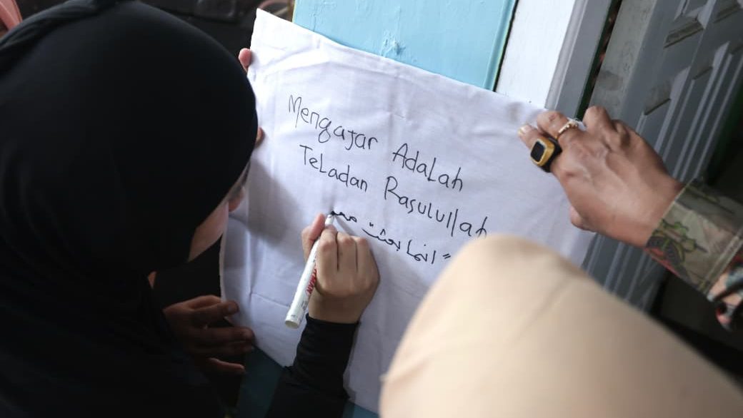 Nawal menerima kain dan spidol itu. Lalu berdiri di dekat dinding. Tanpa tergesa, ia mulai menuliskan sebuah pesan di atas kain putih yang semula kosong. Para guru pun perlahan mendekat. Memperhatikan setiap goresan yang dituliskan.