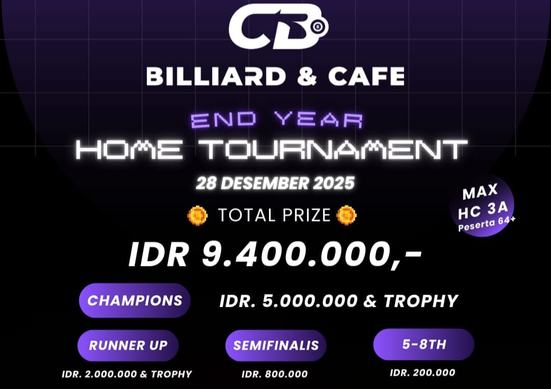 SLAWI, smpantura – Persatuan Olahraga Biliar Seluruh Indonesia (POBSI) Kabupaten Tegal kembali menyelenggarakan Home Turnamen Biliard di CB Billiard and Cafe, Jalan Jenderal Ahmad Yani Nomor 19 Slawi, Kabupaten Tegal, pada 28 Desember 2025. Turnamen itu bertujuan untuk mencari atlet-atlet berbakat untuk di kirimkan dalam Pekan Olahraga Provinsi (Porprov) Jateng tahun 2026 mendatang.