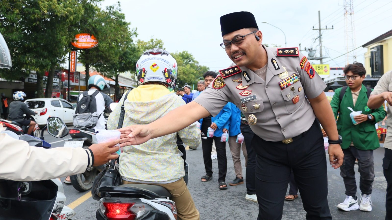 BREBES, smpantura – Jajaran Polres Brebes bareng mahasiswa melakukan aksi sosial berbagi takjil menjelang Waktu buka puasa. Aksi yang di gelar di Jalan Protokol Kota Brebes ini, di pimpin Kapolres Brebes AKBP Lilik Ardhiansyah, Senin (23/2/2026).