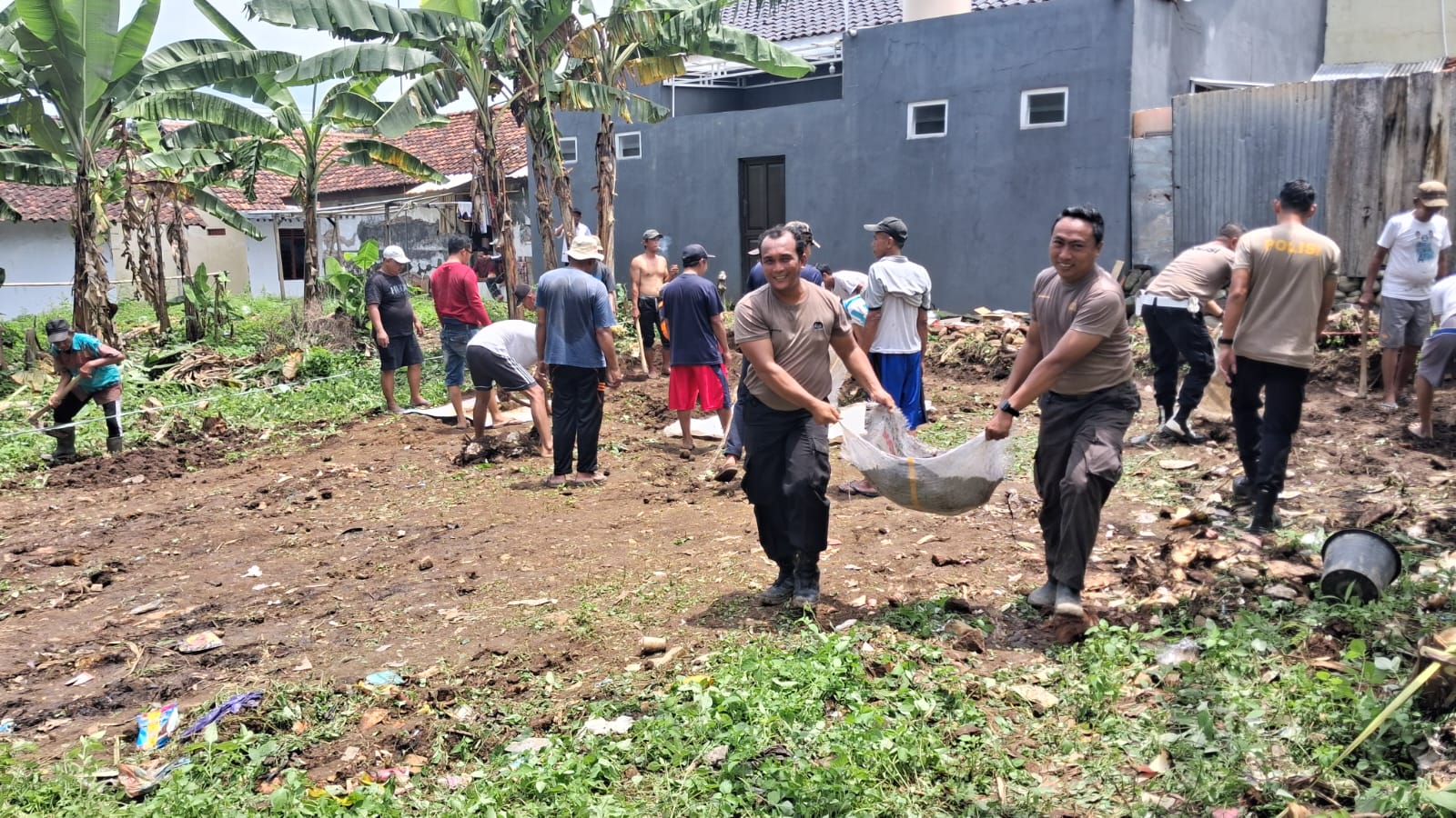 Dalam kegiatan tersebut, polisi dan masyarakat bersama-sama membersihkan area, meratakan tanah, serta menyingkirkan material yang dapat menghambat proses pendirian tenda.