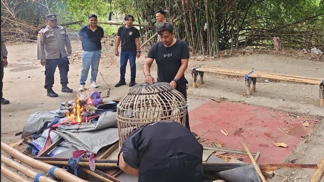 Petugas hanya menemukan sejumlah barang bukti yang di duga di gunakan untuk kegiatan sabung ayam. Di antaranya tiga buah terpal, satu kandang ayam, tiga kursi bambu panjang, serta satu arena sabung.