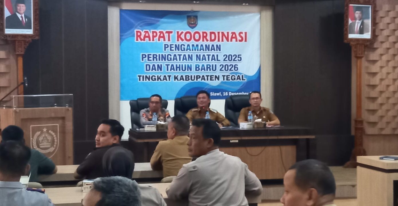 SLAWI, smpantura – Jajaran Polres Tegal menyiapkan sebanyak 10 pos pengamanan untuk Natal dan Tahun Baru 2026. Hal ini terungkap dalam Rapat Koordinasi Pengamanan Peringatan Natal 2025 dan Tahun baru 2026 Tingkat Kabupaten Tegal di Ruang Rapat Bupati Tegal, Selasa (16/12/25).