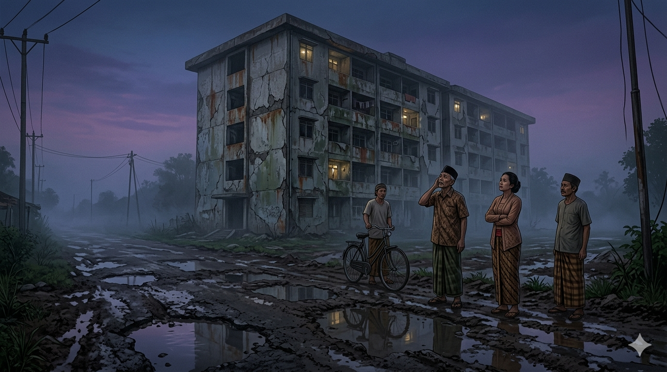 Temboke wis akeh sing mletek, ubin keramike akeh sing pecah toli pating pendusul ora rata. Rusunawa sing karepe nggo mbatu wong sing ora nduwe ben ngrasakna urip anyem. Udan ora kudanan, panas ora kepanasen. Ana kondong nggo turu, ana kondong nggo dayoh, jumblenge ya ana. Repan adang ana panggonane dewek, toli ana sing nggo meme pakean ora ketang seiprit.
