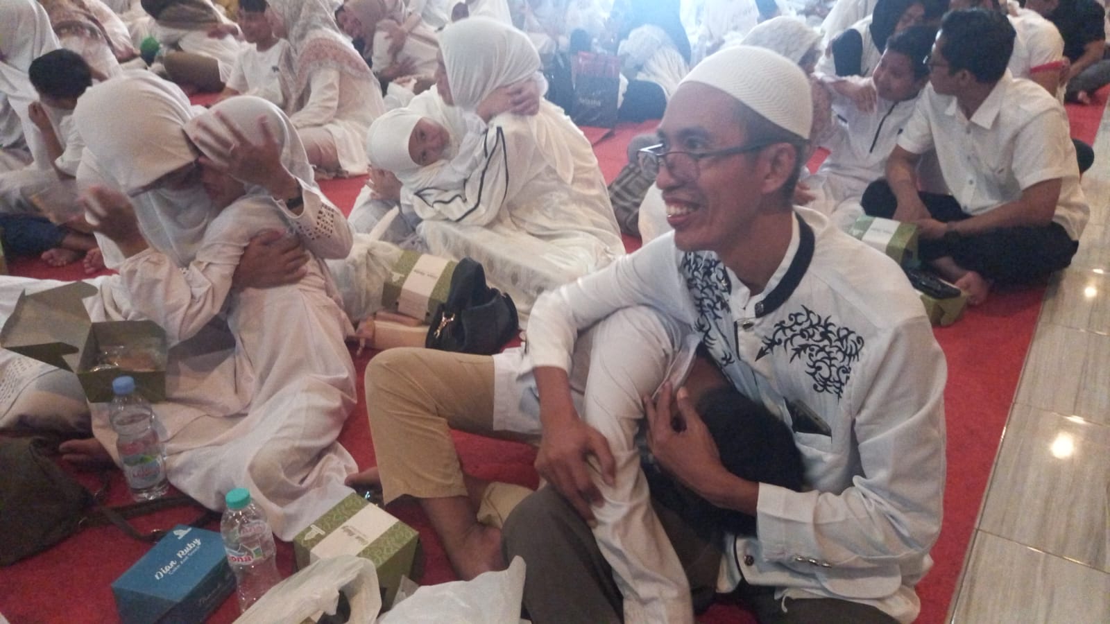 Ia mengajak anak-anak memegang snak yang dibagikan dan menyuapi ayah dan bundanya secara bergantian. Selanjutnya mereka diminta memeluk orangtuanya sebagai ungkapan rasa kasih sayang. Momen ini terasa mengharukan. Banyak diantara orangtua menitikkan air mata haru dan langsung membalas pelukan anak-anaknya.