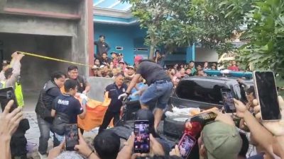 Tim Polres Brebes dan Polsek Banjarharjo tengah mengevakuasi mayat dalam koper yang ditemukan di rumah kosong, di Deaa Sukareja, Kecamatan Banjarharjo, Brebes.