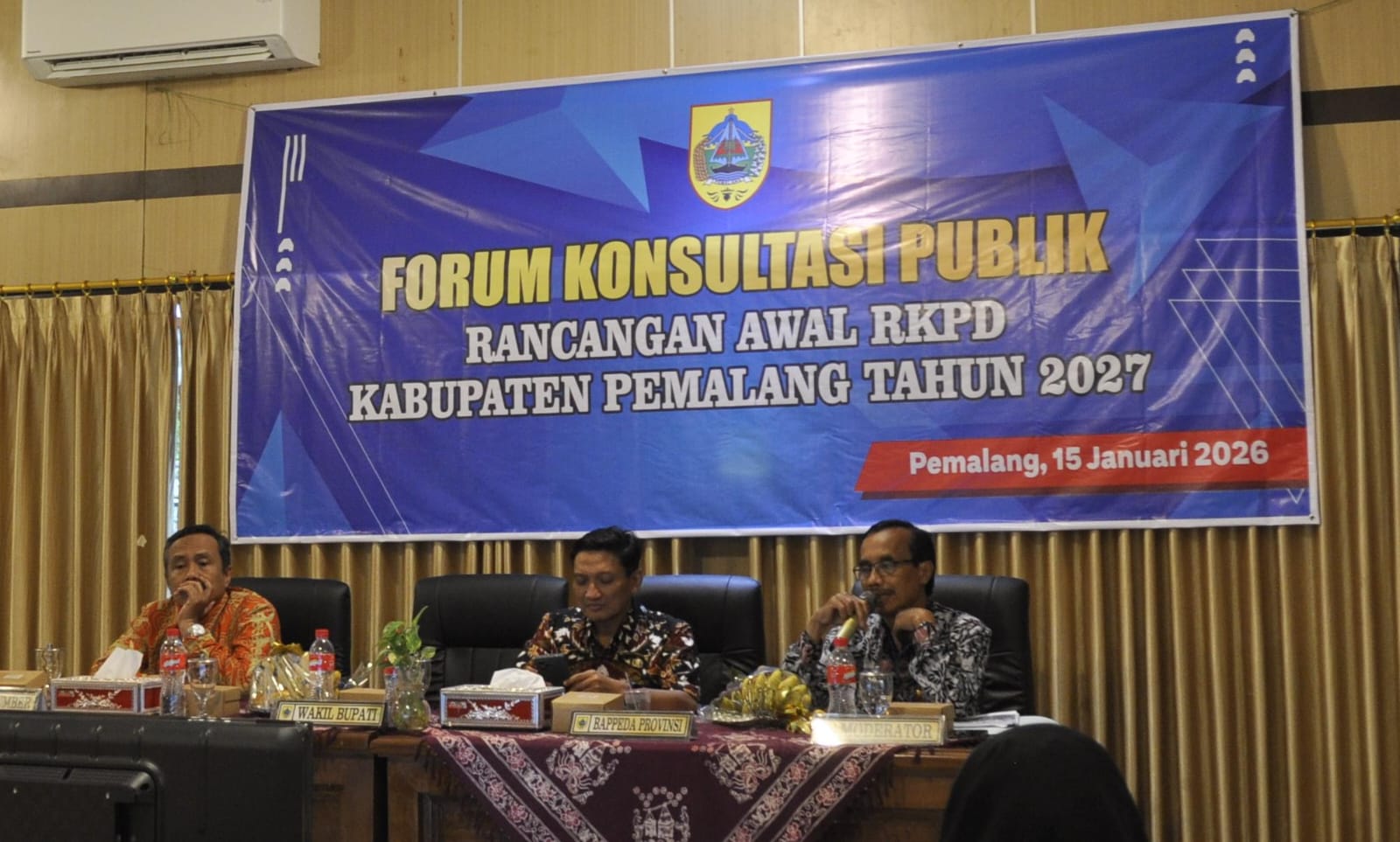 PEMALANG, smpantura – Wakil Bupati Nurkholes membuka rapat Forum Konsultasi Publik Rancangan Awal Rencana Kerja Pemerintah Daerah Kabupaten Pemalang Tahun 2027 di Ruang Rapat Badan Perencanaan Pembangunan Riset dan Inovasi Daerah (Bapperida) setempat. Rapat itu membahas arah kebijakan pembangunan Kabupaten Pemalang tahun 2027.