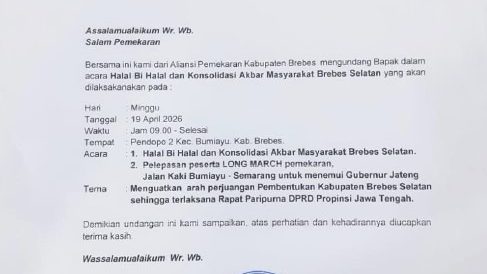 “Long March Pemekaran dengan jalan kaki Bumiayu-Semarang ini, untuk menemui Gubernur Jateng,” katanya dalam undangan tertanggal 3 April 2026 tersebut.